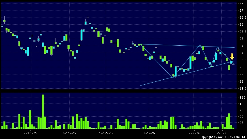 三角形向下突破是指股价的波幅渐渐收窄,在图表上形成三角形般的状态。股价在三角形的末端向下突破,下跌趋势形成,技术走势偏软。(港股报价延迟最少十五分钟。沽空资料截至 2026-03-10 16:25。)