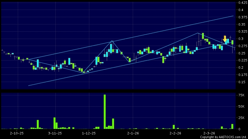 KNT HOLDINGS(01025.HK)  +0.009 (+3.782%)   appears a downside range breakout. Last printed at 0.270; fell 3.571%; on volume of 169.00K shares and turnover of $45.09K