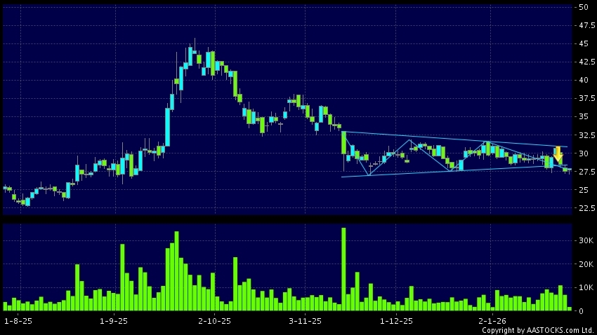 三角形向下突破是指股价的波幅渐渐收窄,在图表上形成三角形般的状态。股价在三角形的末端向下突破,下跌趋势形成,技术走势偏软。(港股报价延迟最少十五分钟。沽空资料截至 2026-01-27 16:25。)