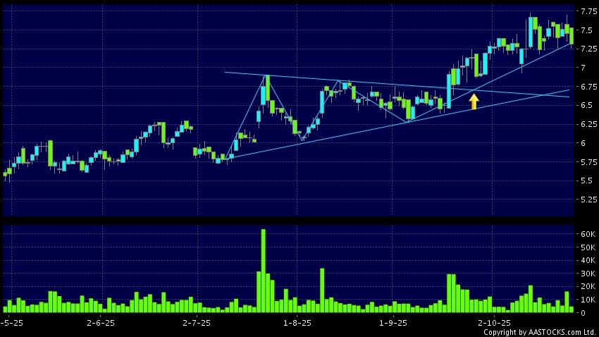 三角形向上突破是指股价的波幅渐渐收窄,在图表上形成三角形般的状态。股价在三角形的末端向上突破,形成上升趋势,技术走势向好。(港股报价延迟最少十五分钟。沽空资料截至 2025-10-31 12:25。)