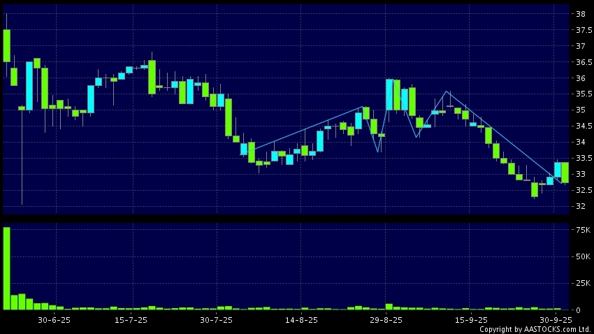 海天味业(03288.HK) +0.040 (+0.122%) 呈现三重顶突破向下。现价报32.700,下跌1.978%,成交量36.65万股,成交额1.20千万。