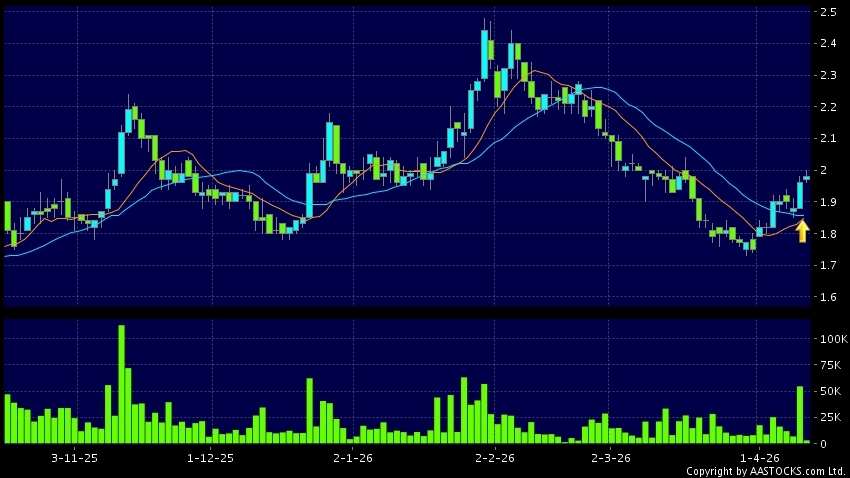 保利置業集團(00119.HK) -0.010 (-0.532%) 沽空 $62.01萬; 比率 2.727% 10天移動平均線升穿20天移動平均線,出現黃金交叉。現價報1.980,上升1.020%,成交量4.73百萬股,成交額9.35百萬。