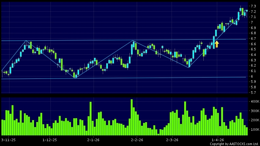 區域突破指股價在過去的一段時間只在一個範圍在內活動,然後股價上升作出突破,升穿區域的頂部,技術走勢向好。(港股報價延遲最少十五分鐘。沽空資料截至 2026-04-24 16:25。)