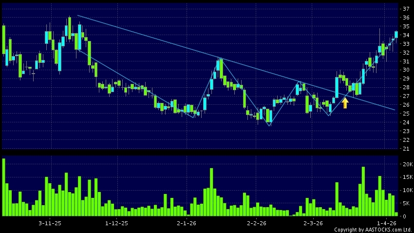 頭肩底是典型的利好訊號,當股價升穿阻力線時,升勢確認股價將持續上升,技術走勢向好。(港股報價延遲最少十五分鐘。沽空資料截至 2026-04-16 16:25。)