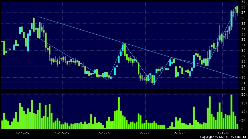 中創新航(03931.HK) +0.520 (+1.394%) 沽空 $1.09千萬; 比率 2.995% 呈現頭肩底向上突破,股價升穿頸線。現價報36.900,下跌2.018%,成交量3.04百萬股,成交額1.13億。