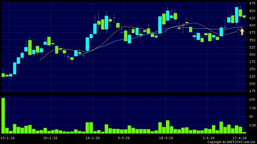 兆易創新(03986.HK) +16.856 (+3.736%) 10天移動平均線升穿20天移動平均線,出現黃金交叉。現價報425.800,下跌1.161%,成交量53.90萬股,成交額2.31億。